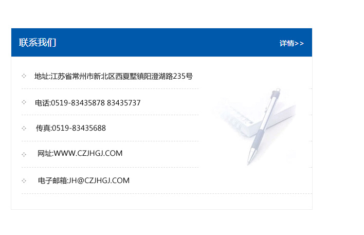 地址:常州市新北區友邦商務大廈1幢16、17層  電話:0519-85101652  傳真:0519-85112595  郵編:213022  網址:www.cz-jiayue_cn.guangzhoujushengedu.com  郵箱:xiajifengaa@163.com